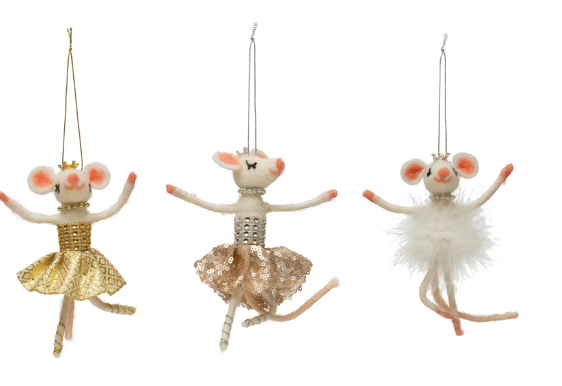 5"H Wool Felt Ballerina Mouse Ornament, Multi Color, 3 Styles
