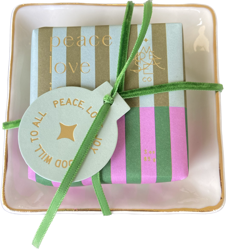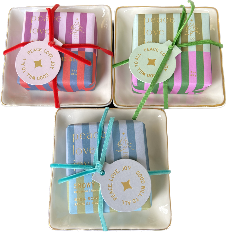 3oz. square wrapped shea soap, comes with a ceramic soap dish that says 'Peace, Love, Joy'