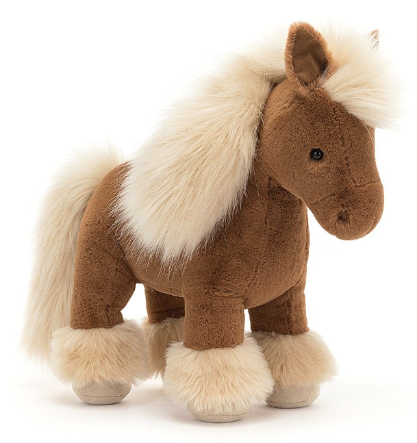 Freya Pony has a rich toffee coat with a silky blonde mane and tail. Standing tall and proud, this delightful pony has elegant feathers on her soft beige hooves. With leaf-fold ears and suedette nostrils, Freya's a dressage champ.