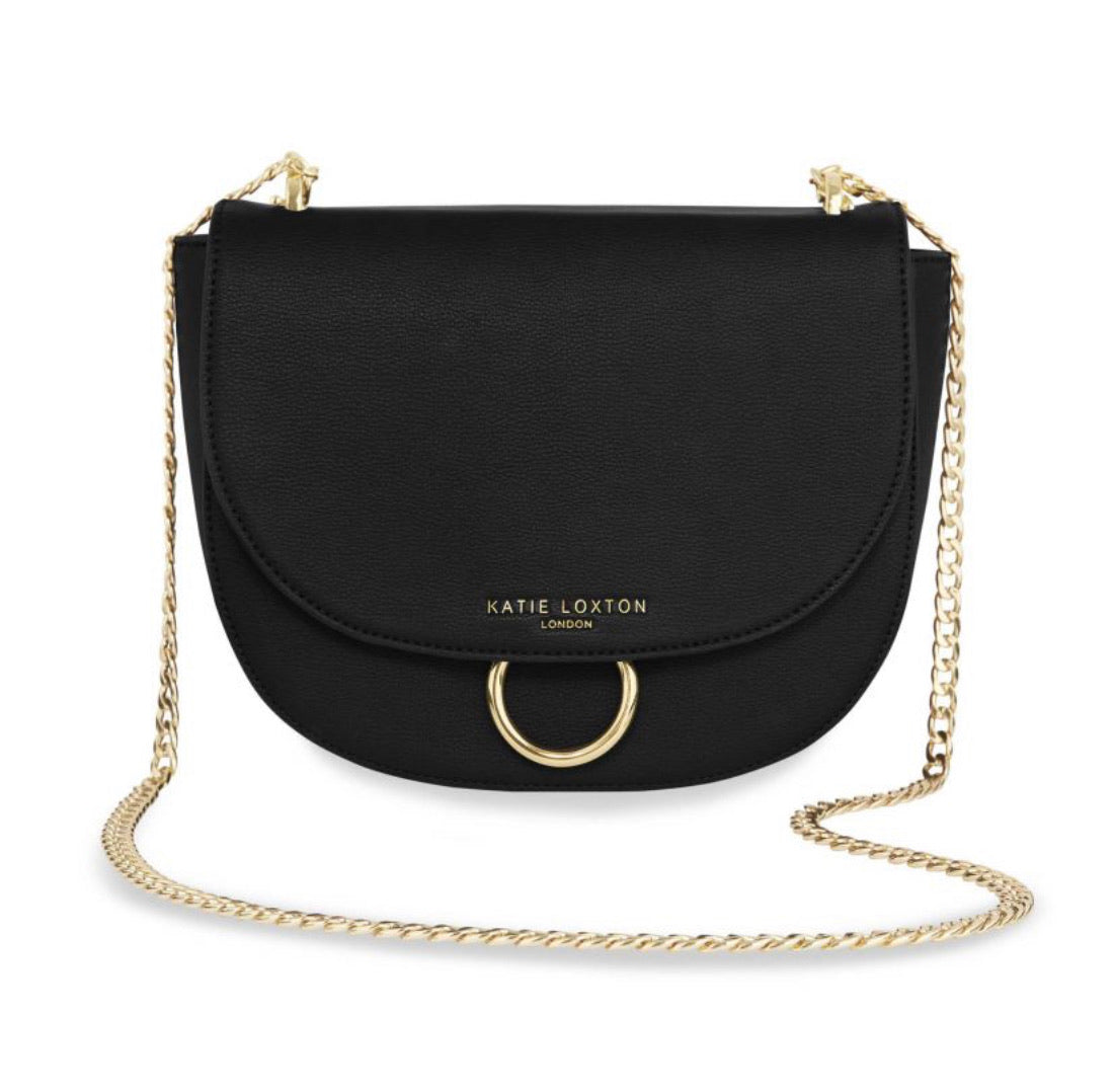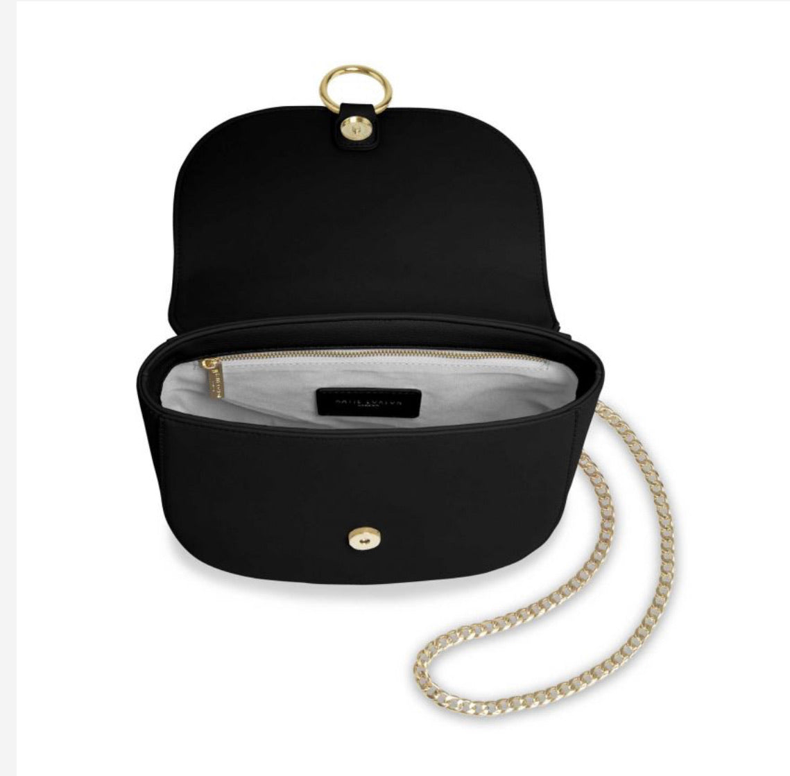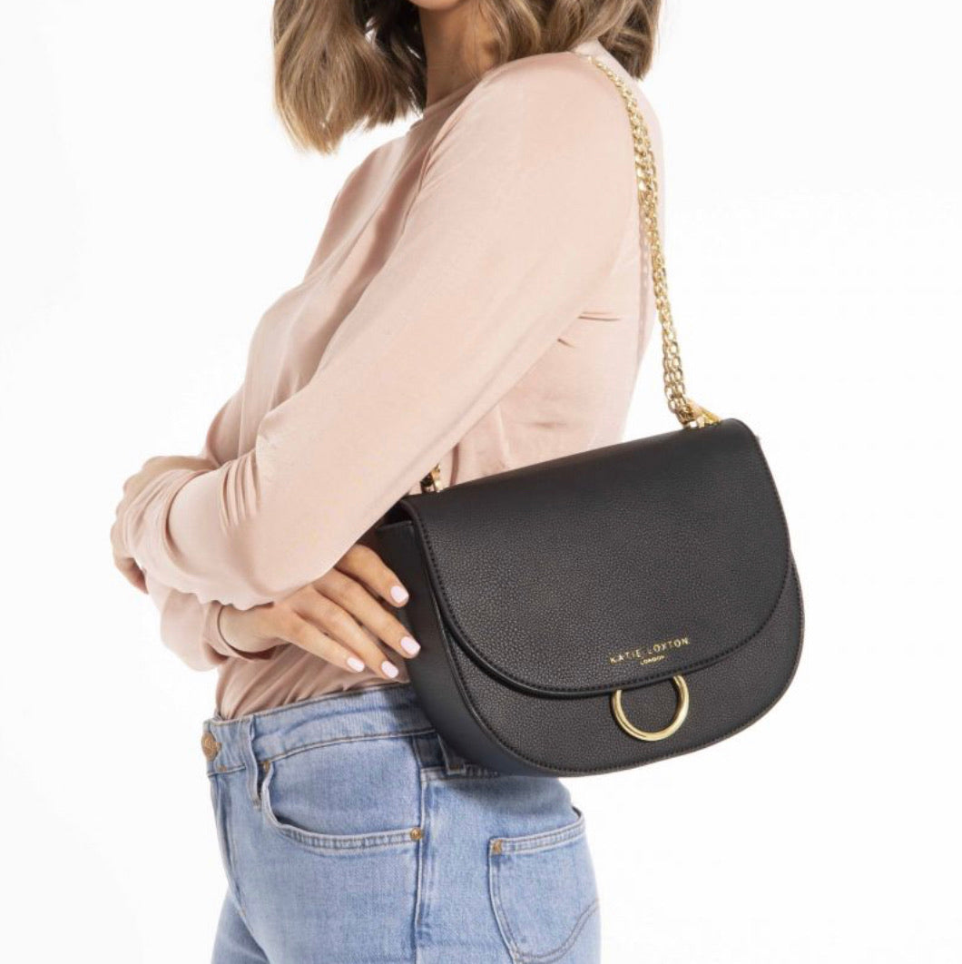 Gold hardware, adjustable gold chain to wear on shoulder or crossbody.