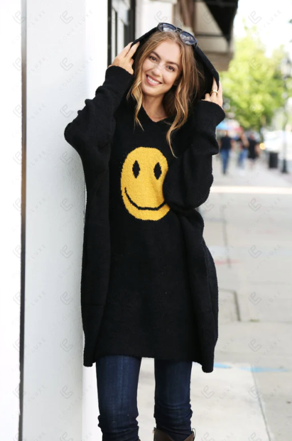 HAPPY FACE PATTERN LUXURY SOFT HOODED WEARABLE BLANKET W/ FRONT POCKET