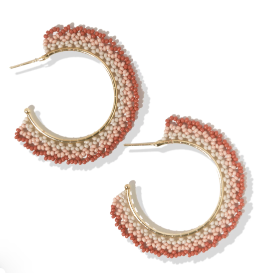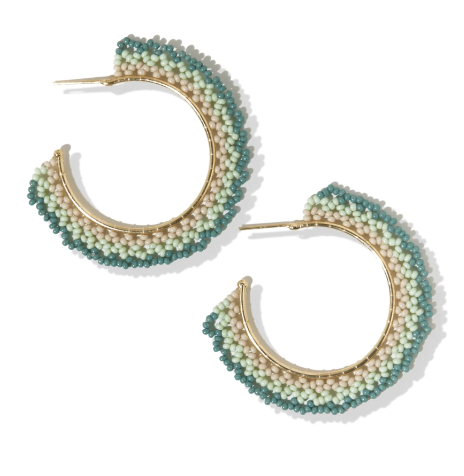They're not your grandma's crochet, but she'd totally approve! Our take on the most classic of shapes - the hoop - shows off the handmade nature of beading like never before. These hoop earrings make a bold statement without all the fuss. Teal, mint + ivory beads join hands to bring you your new favorite boho accessory.
