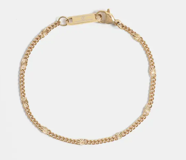 Oh baby. She's back. Meet your new favorite everyday, delicate chain bracelet. With a celestial starburst pattern peppered throughout miniature Cuban links, this bracelet is perfect for every single day wear. With a hypoallergenic and water resistant guarantee, you will absolutely love rocking the Paradise Collection — and feel like vacation when doing so! Designer tip — rock this piece with the Paradise Choker and Paradise Anklet for the complete ensemble. 7" length Lobster clasp closure MATERIAL Hypoallergenic. Water Resistant. Rust-Resistant. Sustainable. Gold: 14k-plated stainless steel. Silver: polished stainless steel. CARE All Marrin Costello Collection Jewelry is crafted of a hypoallergenic + water resistant + sustainable stainless steel base. When not worn, please store in a protected place and use a cleaning cloth to spot treat as needed.