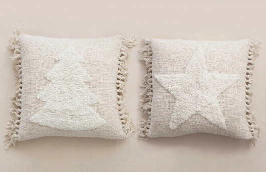 These adorable pillows adds festive decor to any seat. Made out of a cotton blend, these punch hook pillows come in 2 styles, each with tassels and a cream color. These instantly elevate any couch, chair, or bed, and look great in any festive home.