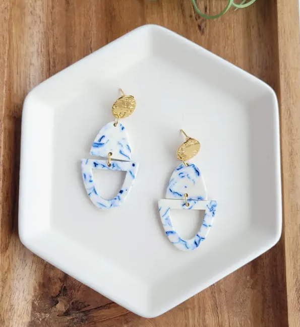 Athena is our layered dangle style with two semi-oval charms that give it a unique shape. It is part of our greek goddess collection inspired by the beautiful whites and blues of greece. * 18K gold-plated hypoallergenic stainless steel posts * 12mm posts