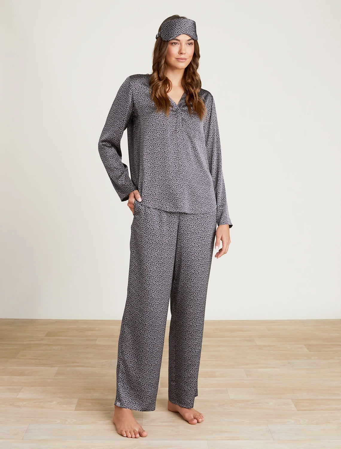 Look chic in your sleepwear with this luxurious animal print Washed Satin Eye Mask PJ Set. Soft and silky, the drawstring waist pants and henley style long sleeve top with keep you comfortable all night long. Packaged in a logo gift box that's perfect for giving. Model is between 5'9" and 5'10" and wearing a size Small.