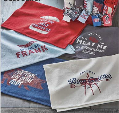 Hand screen printed design on textured pre-washed 100% cotton woven slub fabric for extra softness and absorbency. 5 each of 5 bbq sentiments, natural born griller, meat me in paradise, let me be frank, put pork on your fork & you are the only bun for me. A dishtowel is an easy, inexpensive way to update your kitchen decor and makes a great hostess gift.