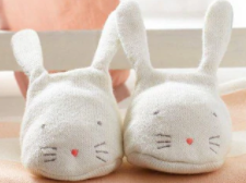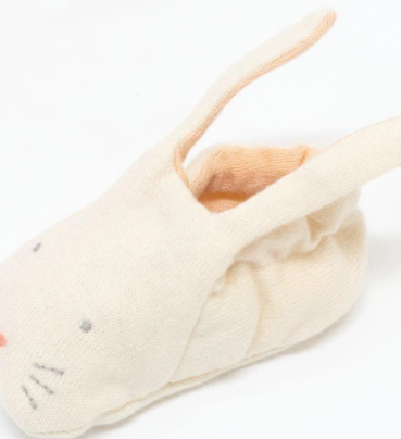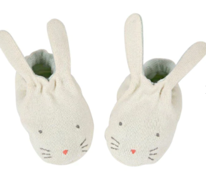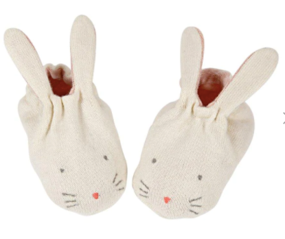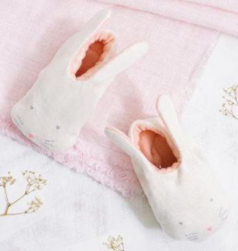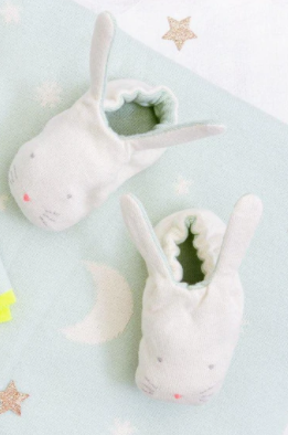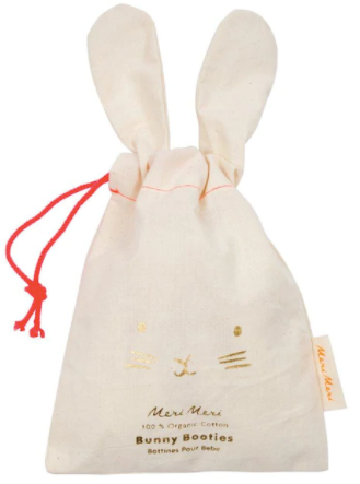 These adorable bunny booties are carefully crafted from knitted organic cotton with a soft colored lining. They have delightful shaped ears, stitched features and are presented in a beautiful bunny drawstring bag. The perfect gift for a new arrival.