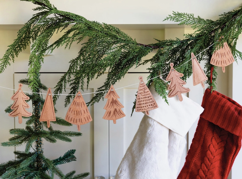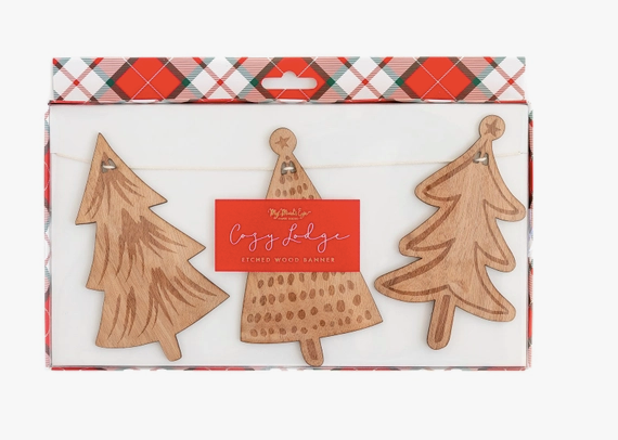 Turn your space in to a winter woodland this Christmas with this wood tree banner. Featuring five etched tree designs this wood banner will add a cozy and rustic feel to your Christmas decor this year. • made with real wood • laser edged design 2 each of 5 unique designs • approximately 5 inches tall x 3 inches wide