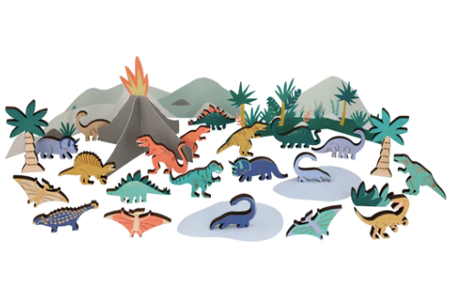 - Contains 20 wooden dinosaurs and 3 wooden foliage pieces