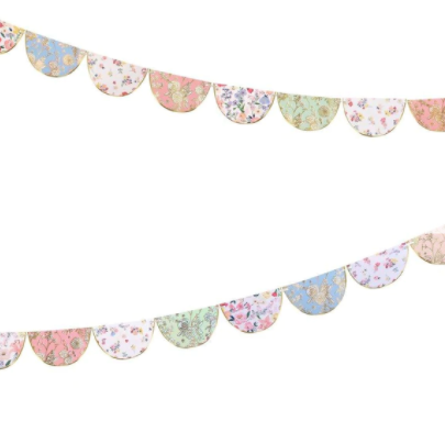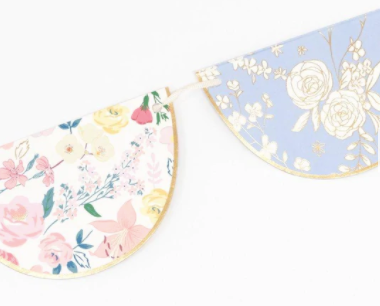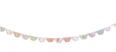 This elegant English Garden Scallop garland will look truly beautiful at any party, or for decorating your home with. Featuring sixteen floral pennants, pre-strung on ivory ribbon, with gold foil detail.