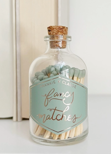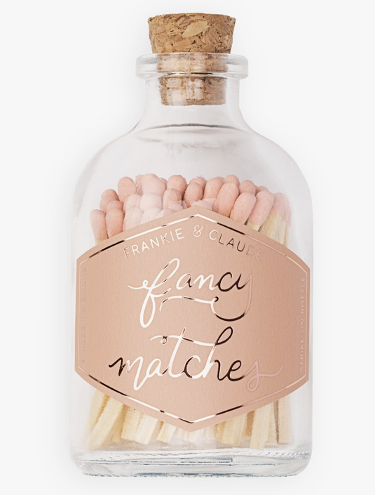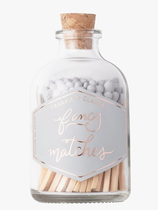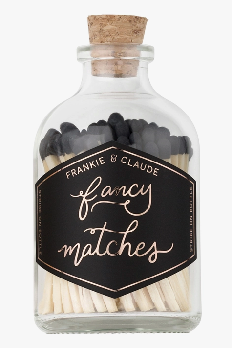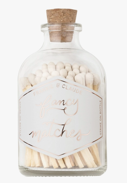 Adorn your mantle with the original oh-so-pretty fancy matches™. Our custom colored matches are tucked into a corked glass jar. A match-striker is affixed to the bottom. Matches are easy to remove; simply turn over the jar and give it a shake. On average a jar of matches will last over a year of use. Jar size: about 3.25" tall x 1.75" wide. Approx. 75 matches included. Each jar is filled by hand in our studio. All jars are labeled with our signature gold foil accented label.