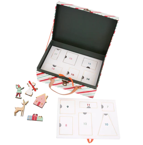 Open the suitcase to reveal numbered trays featuring beautifully crafted decorative wooden festive pieces. Day by day you'll create a charming Christmas village scene, with Santa and his elves, reindeer, a snowman, a sledge full of gifts and a sensational Christmas tree. This is a gift you'll love to bring out every year to celebrate holiday cheer.