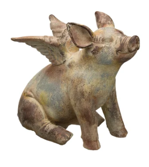 The Flying Pig is a popular icon and comes painted here in rich rustic earth tones. These statuaries are cast using a magnesium oxide formula which is durable and lightweight.