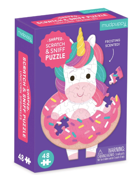The Unicorn Sprinkles 48 Piece Mini Scratch & Sniff Puzzle from Mudpuppy features a colorful image of a unicorn wearing a donut tutu and is frosting scented. This mini puzzle is perfect for on the go travel fun and fits perfectly on airline tray tables.