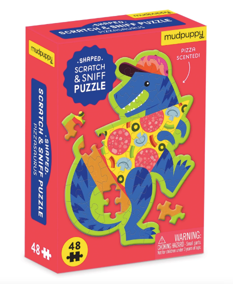 The Pizzasaurus 48 Piece Mini Scratch & Sniff Puzzle from Mudpuppy features a colorful image of a dinosaur with the body of a pizza slice and is cheesy pizza scented. This mini puzzle is perfect for on the go travel fun and fits perfectly on airline tray tables.