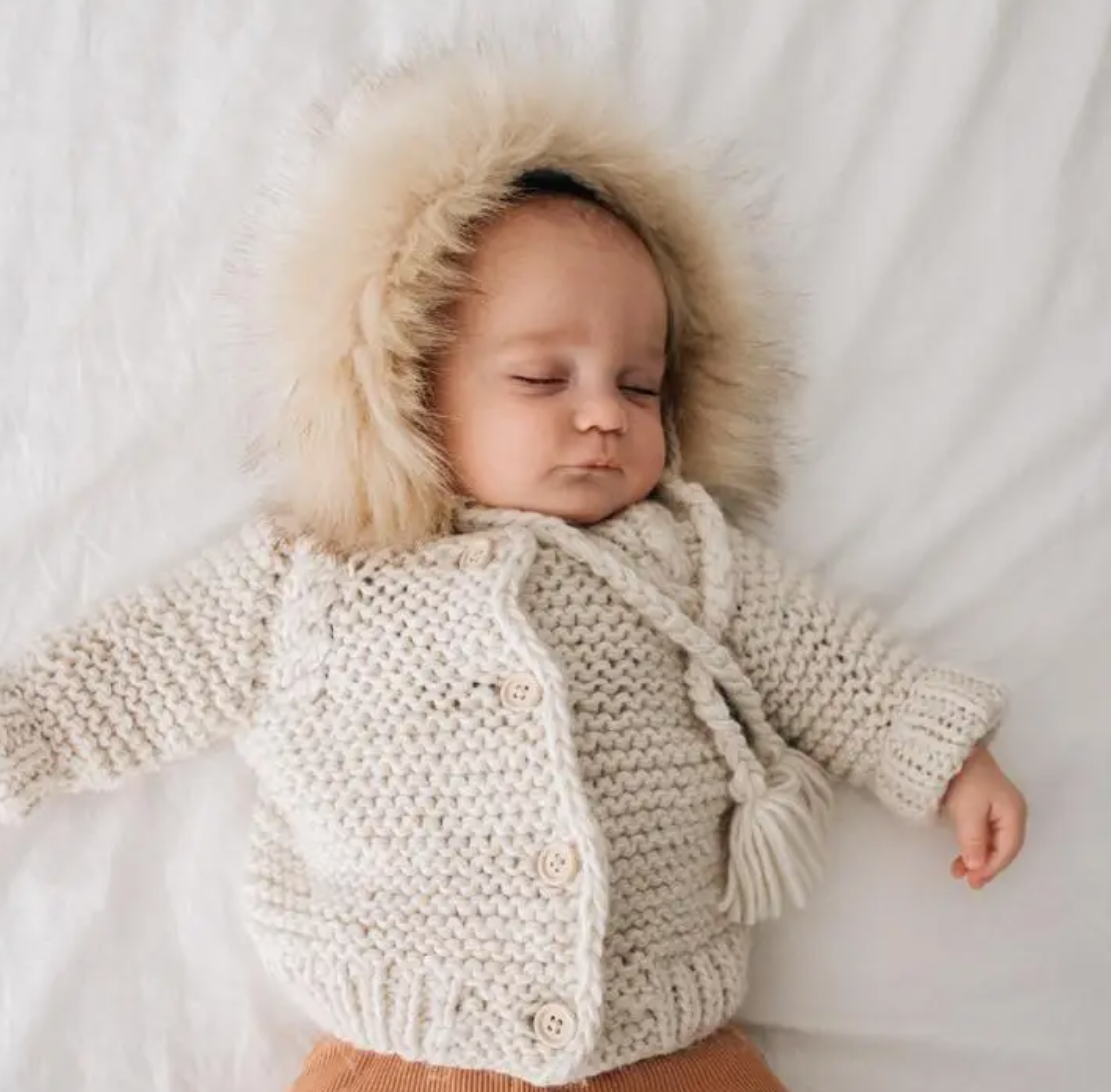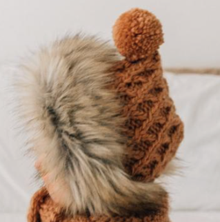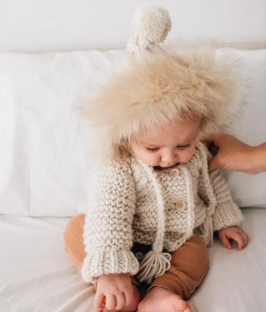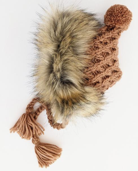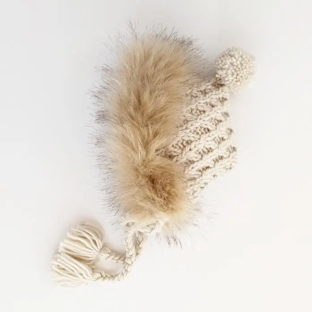 Trimmed in lush tan tipped faux fur, this stunning bonnet is hand knit in cozy Natural Icelandic yarn. It is trimmed with a fun pom pom and has string ties to keep the hat in place. What a perfect shower gift! Use it for photos, dress-up and costumes too.