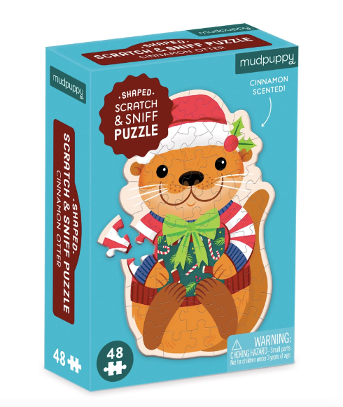 The Cinnamon Otter 48 Piece Scratch and Sniff Shaped Mini Puzzle from Mudpuppy features a colorful image of a festive otter holding a holiday present and is cinnamon scented. This mini puzzle is perfect for on the go travel fun and fits perfectly on airline tray tables.