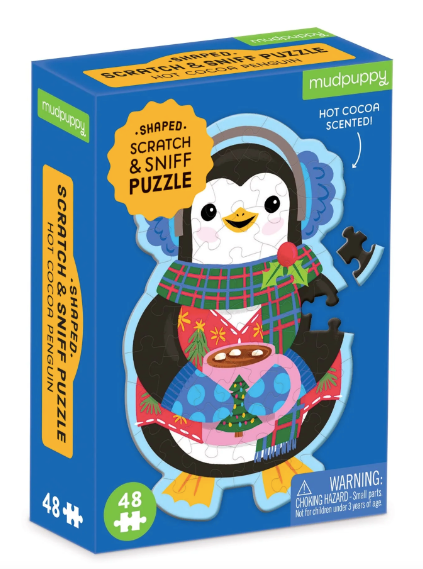 The Hot Cocoa Penguin 48 Piece Scratch and Sniff Shaped Mini Puzzle from Mudpuppy features a colorful image of a festive penguin holding a warm winter drink and is hot cocoa scented. This mini puzzle is perfect for on the go travel fun and fits perfectly on airline tray tables