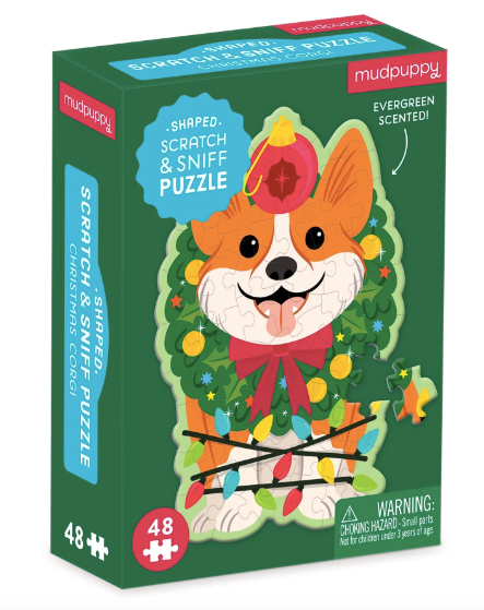 The Christmas Corgi 48 Piece Scratch and Sniff Shaped Mini Puzzle from Mudpuppy features a colorful image of a festive corgi wrapped in holiday lights and is evergreen scented. This mini puzzle is perfect for on the go travel fun and fits perfectly on airline tray tables.