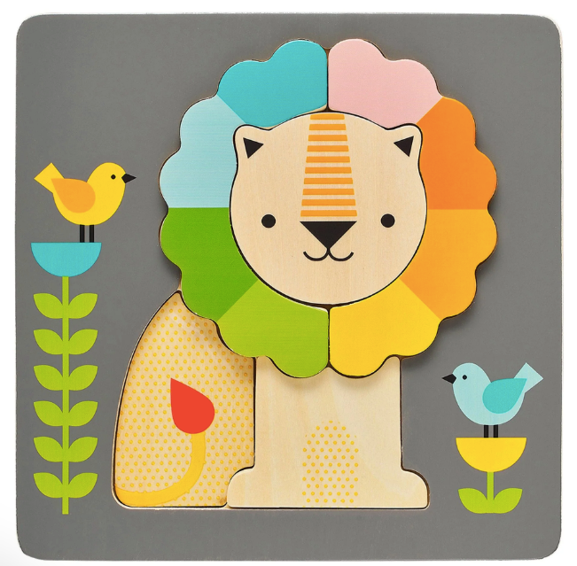Build the friendly lion with his cheerful rainbow mane with this Little Lion Chunky Wooden Tray Puzzle from Petit Collage! Little ones can easily grab onto the five chunky wooden pieces to create their little lion friend in his colorful scene.