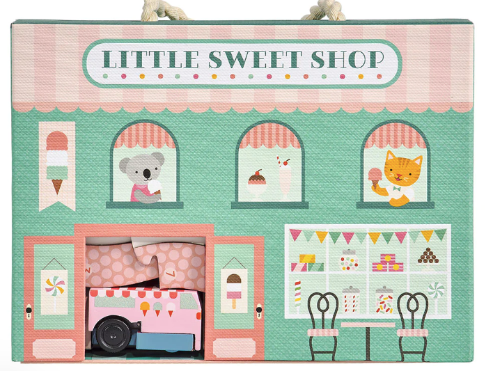 - Includes a double-sided sweet shop, a wooden wind-up ice cream truck, 8 track pieces and 10 pop-out and play pieces