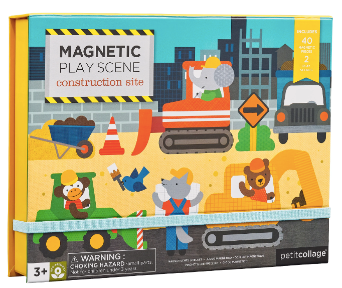 Decorate two construction scenes with little busy animal workers in this Construction Site Magnetic Play Scene from Petit Collage. This portable play set features 2 magnetic scene backgrounds and 40 magnetic pieces.